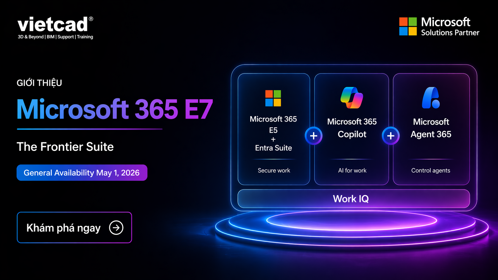 Microsoft 365 E7 (Frontier Suite) ra mắt ngày 1/5/2026 với giá $99/user/tháng, tích hợp AI Copilot, Agent 365 và bảo mật E5. VietCAD tư vấn nâng cấp phù hợp cho doanh nghiệp Việt.
