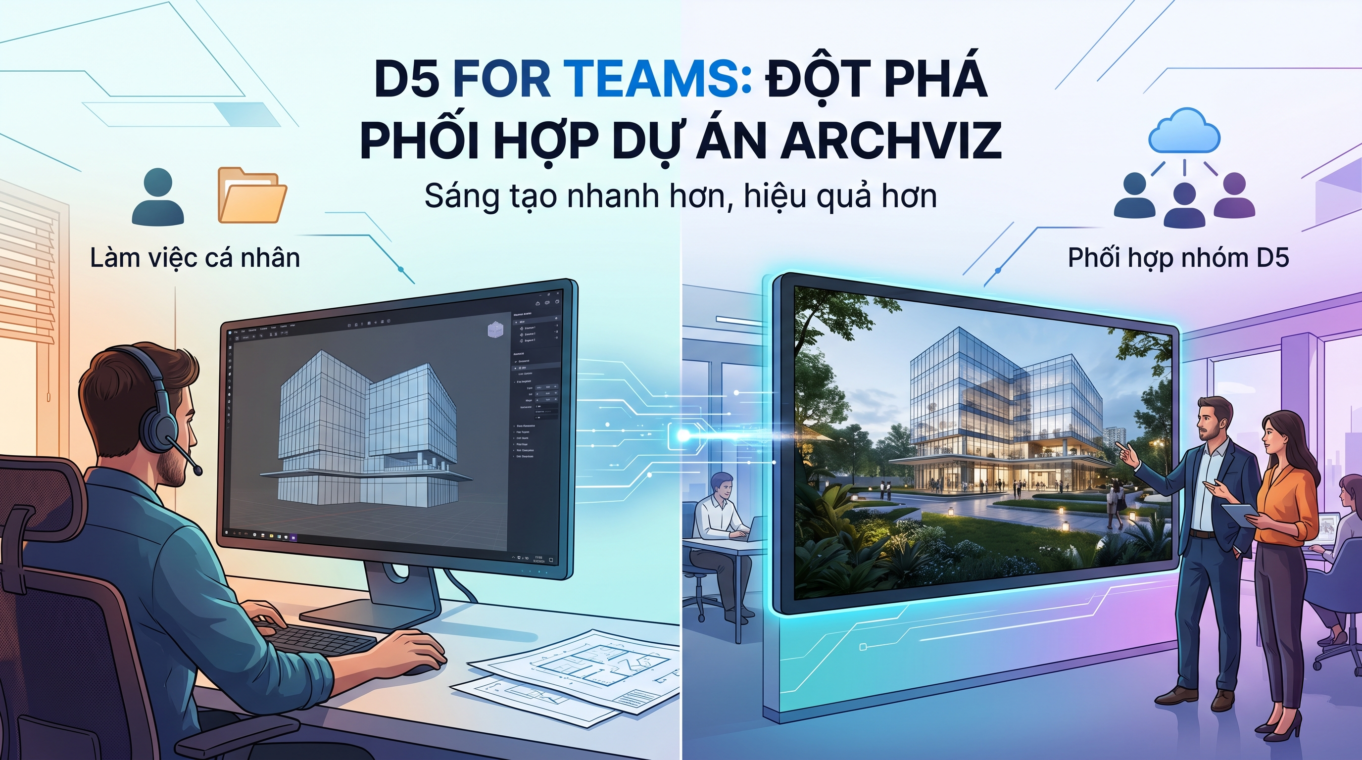 Khám phá cách D5 for Teams giúp các studio kiến trúc tối ưu hóa quy trình làm việc nhóm, loại bỏ xung đột dữ liệu và tăng tốc độ diễn họa 3D thời gian thực.